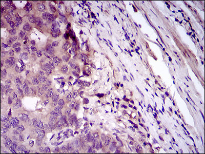 Immunohistochemical analysis of parafin-embedded esophagea cancer tssues using CD33 mouse mAb with DAB staining.