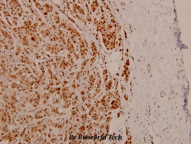 Immunohistochemistry (IHC) analyzes of p-Smad2 (S467) pAb in paraffin-embedded human breast carcinoma tissue at 1:100.