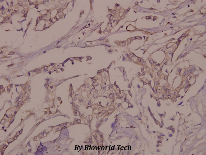 Immunohistochemistry (IHC) analyzes of p-VE-Cadherin (Y731) pAb in paraffin-embedded human breast carcinoma tissue at 1:50.