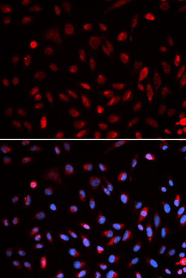 Immunofluorescence analysis of U2OS cells using ERCC1 antibody.Blue: DAPI for nuclear staining.