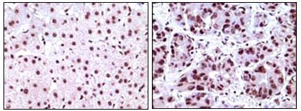 Immunohistochemical analysis of paraffin-embedded human liver carcinoma tissues, showing nuclear localization using NPM mouse mAb with DAB staining.