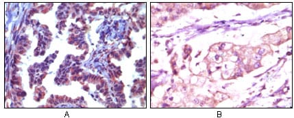 Immunohistochemical analysis of paraffin-embedded human metastatic adenocarcinoma(A) and stomach adenocarcinoma (B), showing cytoplasmic localization using Trim5a mouse mAb with AEC staining (A) and DAB staining(B).