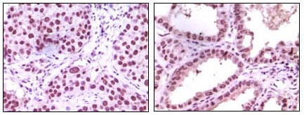 Immunohistochemical analysis of paraffin-embedded human lung carcinoma (left) and kidney carcinoma (right), showing nuclear localization using LSD1 mouse mAb with DAB staining.