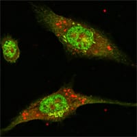 Confocal Immunofluorescence analysis of Eca-109 cells using ERK2 mouse mAb (green).