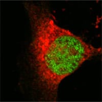Confocal Immunofluorescence analysis of Eca 109 cells using MOF/MYST1 mouse mAb (green), showing nuclear localization.