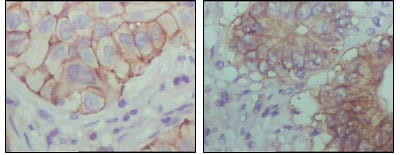 Immunohistochemical analysis of paraffin-embedded human lung cancer (left) and colon cancer (right) showing cytoplasmic localization with DAB staining using EphB1 mouse mAb.