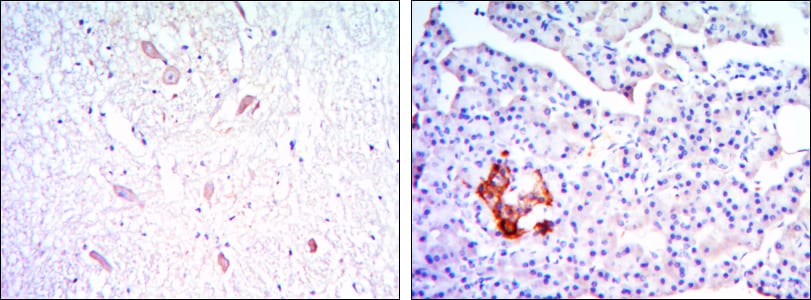 Immunohistochemical analysis of paraffin-embedded human brain tissues (left) and pancreas tissues (right) using KLHL13 mouse mAb with DAB staining.