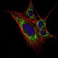 Immunofluorescence analysis of 3T3-L1 cells using KLHL11 mouse mAb (green). Blue: DRAQ5 fluorescent DNA dye. Red: Actin filaments have been labeled with Alexa Fluor-555 phalloidin.