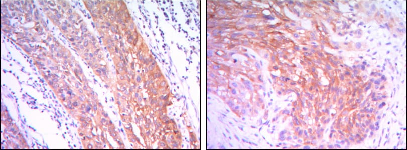 Immunohistochemical analysis of paraffin-embedded human esophagus cancer tissues (left) and human lung cancer (right) using HK2 mouse mAb with DAB staining.