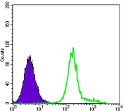 Flow cytometric analysis of K562 cells using HK1 mouse mAb (green) and negative control (purple).