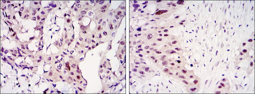 Immunohistochemical analysis of paraffin-embedded human mammary cancer tissues (left) and lung cancer tissues (right) using STAT3 mouse mAb with DAB staining.