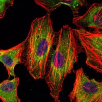Immunofluorescence analysis of Hela cells using STAT3 mouse mAb (green). Blue: DRAQ5 fluorescent DNA dye. Red: Actin filaments have been labeled with Alexa Fluor-555 phalloidin.
