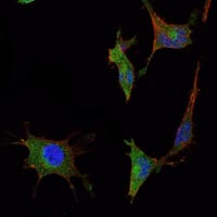 Immunofluorescence analysis of NTERA-2 cells using SMAD5 mouse mAb (green). Blue: DRAQ5 fluorescent DNA dye. Red: Actin filaments have been labeled with Alexa Fluor-555 phalloidin.