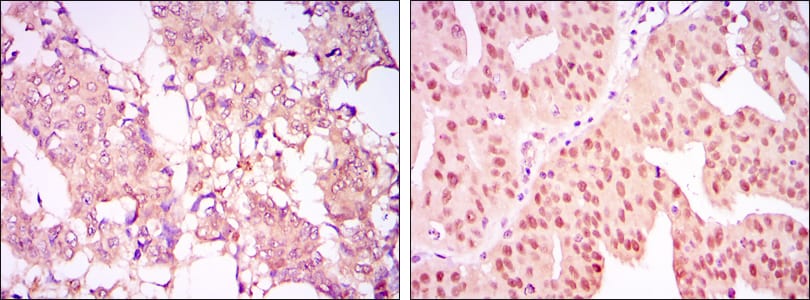 Immunohistochemical analysis of paraffin-embedded human breast cancer tissues (left) and ovarian cancer tissues (right) using CARM1 mouse mAb with DAB staining.