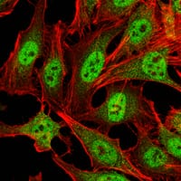 Immunofluorescence analysis of Hela cells using CRAM1 mouse mAb (green). Red: Actin filaments have been labeled with Alexa Fluor-555 phalloidin.