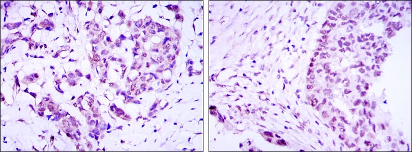 Immunohistochemical analysis of paraffin-embedded human breast cancer (left) and ovarian cancer (right) using CRTC3 mouse mAb with DAB staining.