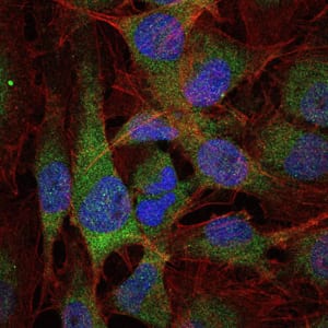 Immunofluorescence analysis of U251 cells using NFKB1 mouse mAb (green). Blue: DRAQ5 fluorescent DNA dye. Red: Actin filaments have been labeled with Alexa Fluor-555 phalloidin.