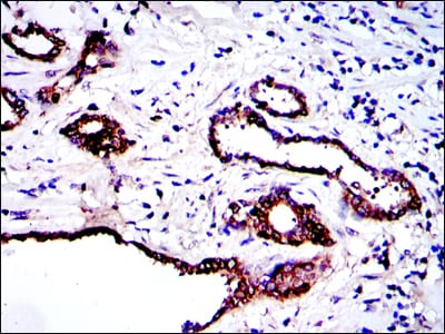 Immunohistochemical analysis of paraffin-embedded human prostate tissues using PRK2 mouse mAb with DAB staining.