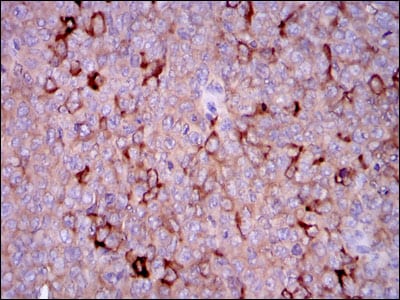 Immunohistochemical analysis of paraffin-embedded human ovarian cancer tissues using G6PD mouse mAb with DAB staining.