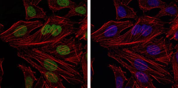 Immunofluorescence analysis of Hela cells using BMI1 mouse mAb (green). Blue: DRAQ5 fluorescent DNA dye. Red: Actin filaments have been labeled with Alexa Fluor-555 phalloidin.
