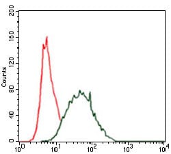 Flow cytometric analysis of HeLa cells using CK5 mouse mAb (green) and negative control (red).