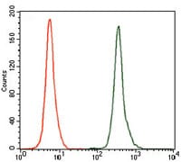 Flow cytometric analysis of K562 cells using NR6A1 mouse mAb (green) and negative control (red).