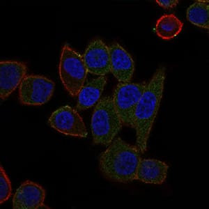 Immunofluorescence analysis of HepG2 cells using ABCB5 mouse mAb (green). Blue: DRAQ5 fluorescent DNA dye. Red: Actin filaments have been labeled with Alexa Fluor-555 phalloidin.