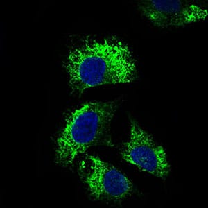 Immunofluorescence analysis of Hela cells using IL2RA mouse mAb (green). Blue: DRAQ5 fluorescent DNA dye.