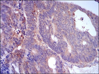 Immunohistochemical analysis of paraffin-embedded human rectum cancer tissues using PLIN2 mouse mAb with DAB staining.