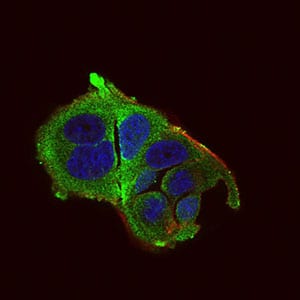 Immunofluorescence analysis of MCF-7 cells using DDIT3 mouse mAb (green). Blue: DRAQ5 fluorescent DNA dye. Red: Actin filaments have been labeled with Alexa Fluor-555 phalloidin. Secondary antibody from Fisher (Cat#: 35503)