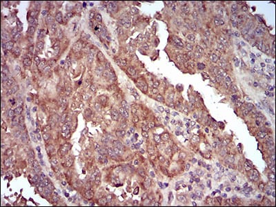 Immunohistochemical analysis of paraffin-embedded human endometrial cancer tissues using CAV2 mouse mAb with DAB staining.