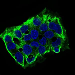 Immunofluorescence analysis of HepG2 cells using SDC1 mouse mAb (green). Blue: DRAQ5 fluorescent DNA dye. Secondary antibody from Fisher (Cat#: 35503)