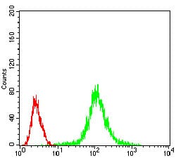 Flow cytometric analysis of Jurkat cells using PPP1CB mouse mAb (green) and negative control (red).