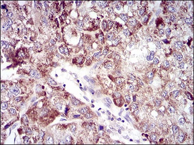 Immunohistochemical analysis of paraffin-embedded human liver cancer tissues using UBE2C mouse mAb with DAB staining.