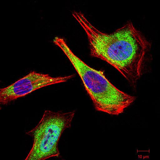 Immunofluorescence analysis of Hela cells using ATG5 mouse mAb (green). Blue: DRAQ5 fluorescent DNA dye. Red: Actin filaments have been labeled with Alexa Fluor- 555 phalloidin. Secondary antibody from Fisher (Cat#: 35503)
