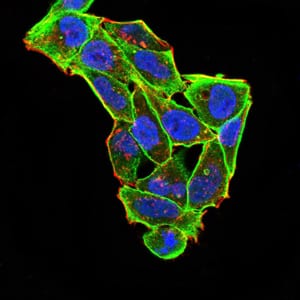 Immunofluorescence analysis of Hela cells using RND3 mouse mAb (green). Blue: DRAQ5 fluorescent DNA dye. Red: Actin filaments have been labeled with Alexa Fluor- 555 phalloidin. Secondary antibody from Fisher (Cat#: 35503)