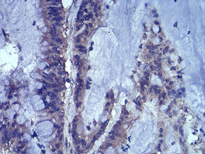 Immunohistochemical analysis of paraffin-embedded human colon cancer tissues using LEF1 mouse mAb with DAB staining.