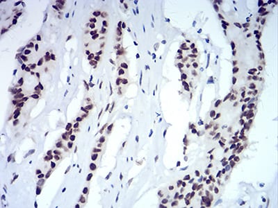 Immunohistochemical analysis of paraffin-embedded human colon cancer tissues using CBX5 mouse mAb with DAB staining.