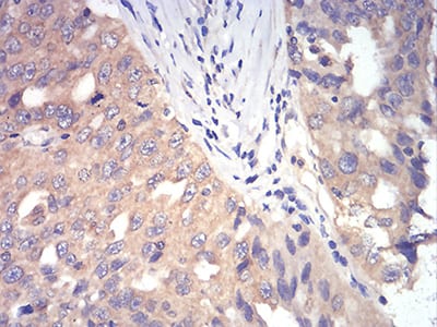 Immunohistochemical analysis of paraffin-embedded human ovarian cancer tissues using DDX3X mouse mAb with DAB staining.