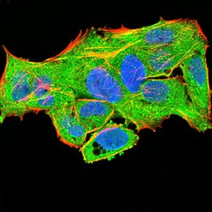 Immunofluorescence analysis of Hela cells using PLCG1 mouse mAb (green). Blue: DRAQ5 fluorescent DNA dye. Red: Actin filaments have been labeled with Alexa Fluor- 555 phalloidin. Secondary antibody from Fisher (Cat#: 35503)