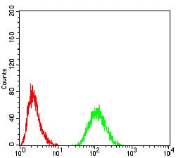 Flow cytometric analysis of Hela cells using RAD21 mouse mAb (green) and negative control (red).