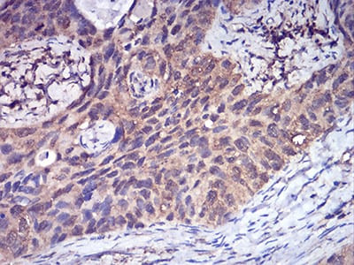 Immunohistochemical analysis of paraffin-embedded human cervical cancer tissues using CFHR5 mouse mAb with DAB staining.