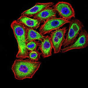 Immunofluorescence analysis of MCF-7 cells using PSMC3 mouse mAb (green). Blue: DRAQ5 fluorescent DNA dye. Red: Actin filaments have been labeled with Alexa Fluor- 555 phalloidin. Secondary antibody from Fisher (Cat#: 35503)