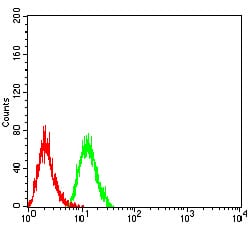 Flow cytometric analysis of Hela cells using PSMC3 mouse mAb (green) and negative control (red).