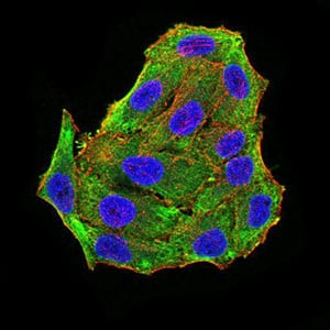 Immunofluorescence analysis of Hela cells using RBFOX3 mouse mAb (green). Blue: DRAQ5 fluorescent DNA dye. Red: Actin filaments have been labeled with Alexa Fluor- 555 phalloidin. Secondary antibody from Fisher (Cat#: 35503)
