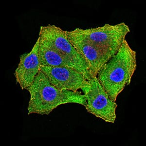 Immunofluorescence analysis of Hela cells using RBFOX3 mouse mAb (green). Blue: DRAQ5 fluorescent DNA dye. Red: Actin filaments have been labeled with Alexa Fluor- 555 phalloidin. Secondary antibody from Fisher (Cat#: 35503)