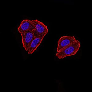 Immunofluorescence analysis of Hela cells using ZFP91 mouse mAb. Blue: DRAQ5 fluorescent DNA dye. Red: Actin filaments have been labeled with Alexa Fluor- 555 phalloidin.
