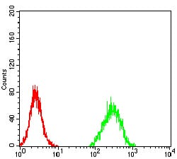 Flow cytometric analysis of Hela cells using ZFP91 mouse mAb (green) and negative control (red).