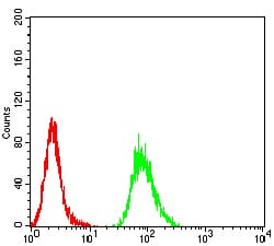 Flow cytometric analysis of Hela cells using VP2 mouse mAb (green) and negative control (red).