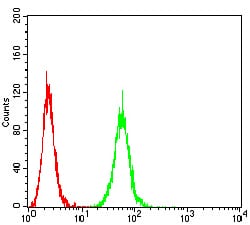 Western blot analysis using P2RX7 mouse mAb against A431 (1), U251 (2), Hela (3), U937 (4), and HepG2 (5) cell lysate.